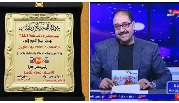 يتقدم الصحفي والإعلامي “أسامه أبو العنين” رئيس تحرير جريدة “حق المواطن الإخبارية” ومقدم برنامج “بلدنا المحروسة” بكامل شكره وعميق إمتنانه، لشركة “T.M.S” للإنتاج الفني والإعلامي، علي تكريمه ضمن مجموعه من الكوادر في مجال الصحافه والإعلام وبعض المجالات الاخري، مختصآ بالشكر رئيس مجلس الإدارة لشركه T.M.S للإنتاج الفني والإعلامي،