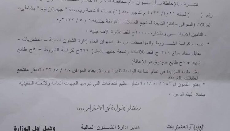 يعلن ديوان عام محافظة البحر الأحمر عن طرح مزايدة محلية لسنة ٢٠٢١/ ٢٠٢٢ م لتأجير (١) صالة أنشطة رياضية “جيمانيزيوم ” بشاطئ العائلات ( السواقى سابقا ) بالغردقة جلسة ١٨ / ٥/ ٢٠٢٢ م