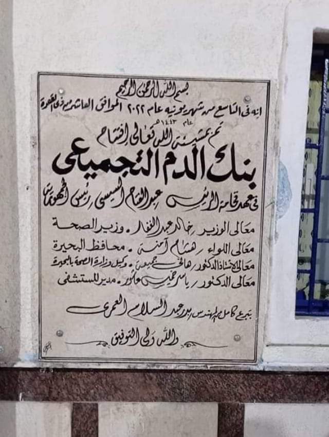 الجدير بالذكر أنه تم اليوم إفتتاح بنك الدم التجميعي بمستشفي المحمودية المركزي