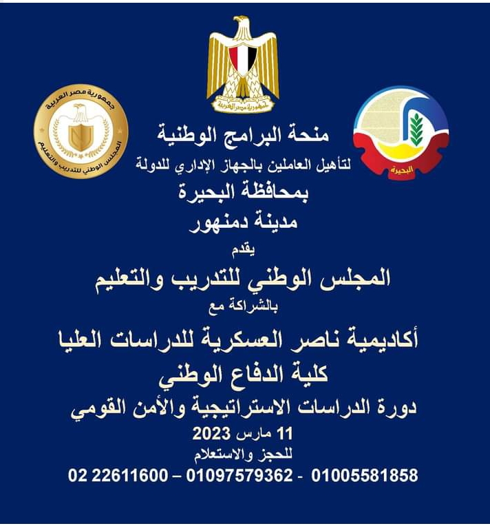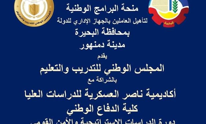 مشيداً بأن المجلس الوطني للتدريب والتعليم يهدف إلى الارتقاء بالخدمات التعليمية والتدريبية، وأيضا تعزيز الاستثمار البشري، وإتاحة التعلم للجميع والحفاظ على جودة الأداء المهني من خلال طرح المنح والمبادرات الوطنيه، لرفع كفاءة العاملين بالقطاع الحكومي والعاملين في الجهاز الإداري للدولة والقطاع العام وقطاع الاعمال والهيئات ومنظمات المجتمع المدني والجامعات المصريه الحكومية بالتعاون مع وزارة الدفاع وأكاديمية ناصر العسكرية للدراسات وكلية الدفاع الوطني، طبقا للبروتوكول المبرم بينهم من خلال نخبه من المحاضرين من أكاديمية ناصر العسكرية وكلية الدفاع الوطني، وذلك ولأول مره أن يكون في رحاب كلية الآداب جامعة دمنهور من خلال وفد رفيع المستوى من اكاديمية ناصر العسكرية وكلية الدفاع الوطني والمجلس الوطني . متمنيا أن تقدم الجامعة والكلية ما يليق بهذا الحدث الفريد من نوعه بالمحافظة.