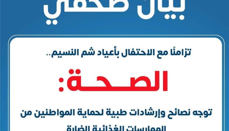 وجهت وزارة الصحة والسكان، عدة نصائح طبية وإرشادات وقائية، تزامنًا مع الاحتفال بأعياد شم النسيم، ضمن خطة التأمين الطبي التي تطبقها الوزارة لضمان سلامة وأمان الغذاء، ولحماية المواطنين من الممارسات الغذائية الضارة، حرصًا على الصحة العامة.