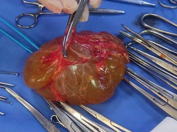 والتي حضرت إلى العيادة الخارجية تشكو من آلام متكررة في البطن، وبعد إجراء الفحوصات اللازمة، تبين وجود ورم ناشئ من البنكرياس بحجم يبلغ حوالي ١٠١١١٦ سم.