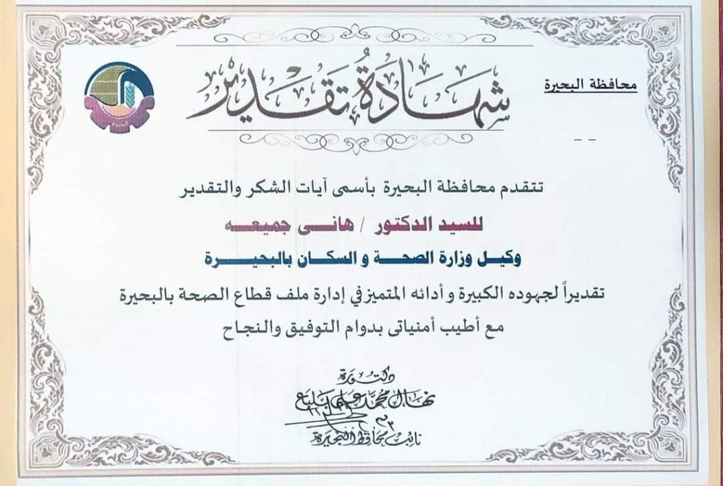 حيث قامت الدكتورة “نهال بلبع” نائب محافظ البحيرة، والقائم بعمل محافظ البحيرة، بتسليم الدكتور “هاني جميعة” وكيل وزارة الصحة بالبحيرة درع التميز في الآداء،