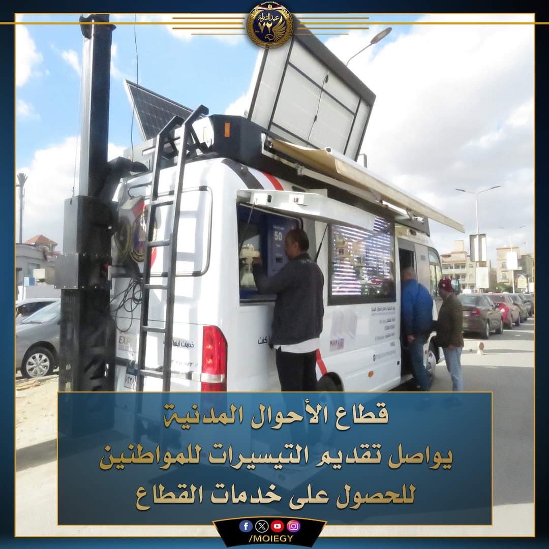 إستكمالاً لإستراتيجية وزارة الداخلية الهادفة إلى تفعيل إستخدام التكنولوجيا الحديثة للإرتقاء بمستوى الخدمات الأمنية الجماهيرية الإلكترونية التى تقدمها قطاعات الوزارة والتى تسعى إلى تسهيل الإجراءات وسرعة تقديم الخدمات للمواطنين ، وفى ضوء إستحداث قطاع الأحوال المدنية بوزارة الداخلية لسيارات الخدمة الفورية “إكسبريس” .. فقد تقرر الدفع بعدد (3) سيارات لمواقع (داون تاون ومجمع البنوك “بالتجمع الخامس بمحافظة القاهرة”) ، (هايبر وان بالشيخ زايد بمحافظة الجيزة) لإستخراج الأوراق الثبوتية وبطاقات الرقم القومى للمواطنين.