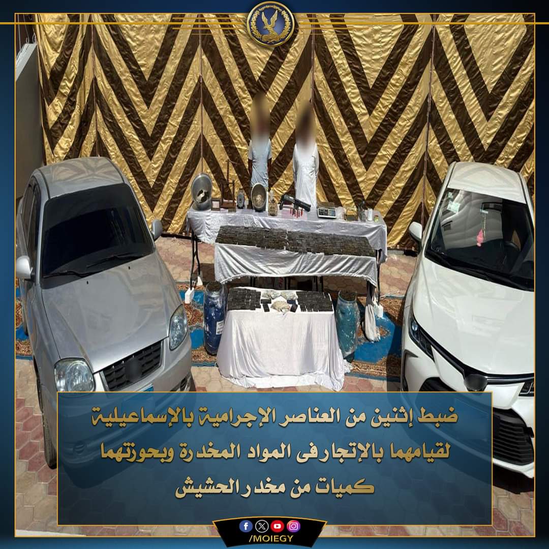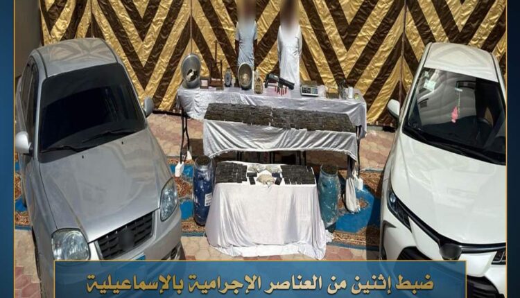 أسفرت جهود قطاع الأمن العام بمشاركة مديرية أمن الإسماعيلية عن ضبط (إثنين من العناصر الإجرامية – مقيمان بدائرة قسم شرطة ثالث الإسماعيلية ومركز شرطة أبو صوير “لهما معلومات جنائية”) حال تواجدهما بإحدى المزارع بدائرة مركز شرطة أبو صوير وبحوزتهما (كمية لمخدر الحشيش وزنت 40 كيلو جرام – 8 كيلو جرام لمخدر الحشيش الخام – مكبس هيدروليكى بمشتملاته لتصنيع مخدر الحشيش – بندقية خرطوش وعدد من الطلقات – 2 سيارة ملاكى – مبلغ مالى).