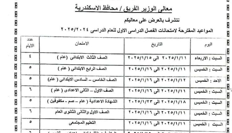 محافظ الإسكندرية يعتمد مواعيد امتحانات الفصل للدراسي الأول للعام الدراسي 2024 /2025 ، لجميع صفوف المراحل التعليمية بالتعليم العام والتعليم الفني والشهادة الإعدادية