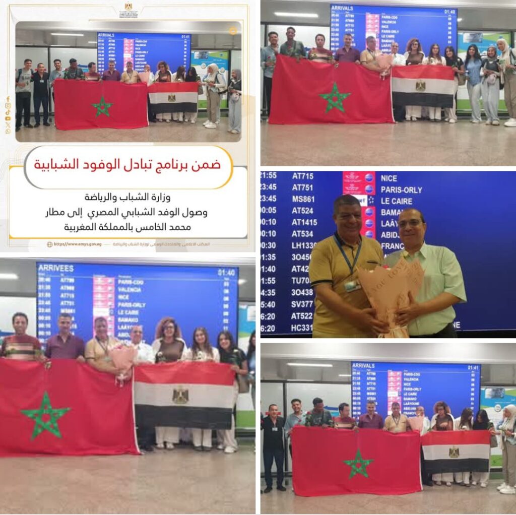 انطلاقًا من عمق العلاقات الثنائية والروابط الأخوية التي تجمع بين جمهورية مصر العربية والمملكة المغربية الشقيقة، وفي إطار التعاون الشبابي المشترك بين البلدين، وصل الوفد الشبابي المصري المرشح من قبل وزارة الشباب والرياضة إلى مطار محمد الخامس بالمملكة المغربية، للمشاركة في فعاليات برنامج تبادل الوفود المصري – المغربي، والمقرر تنفيذه خلال الفترة من ٢٣ حتى ٣٠ أغسطس الجاري.