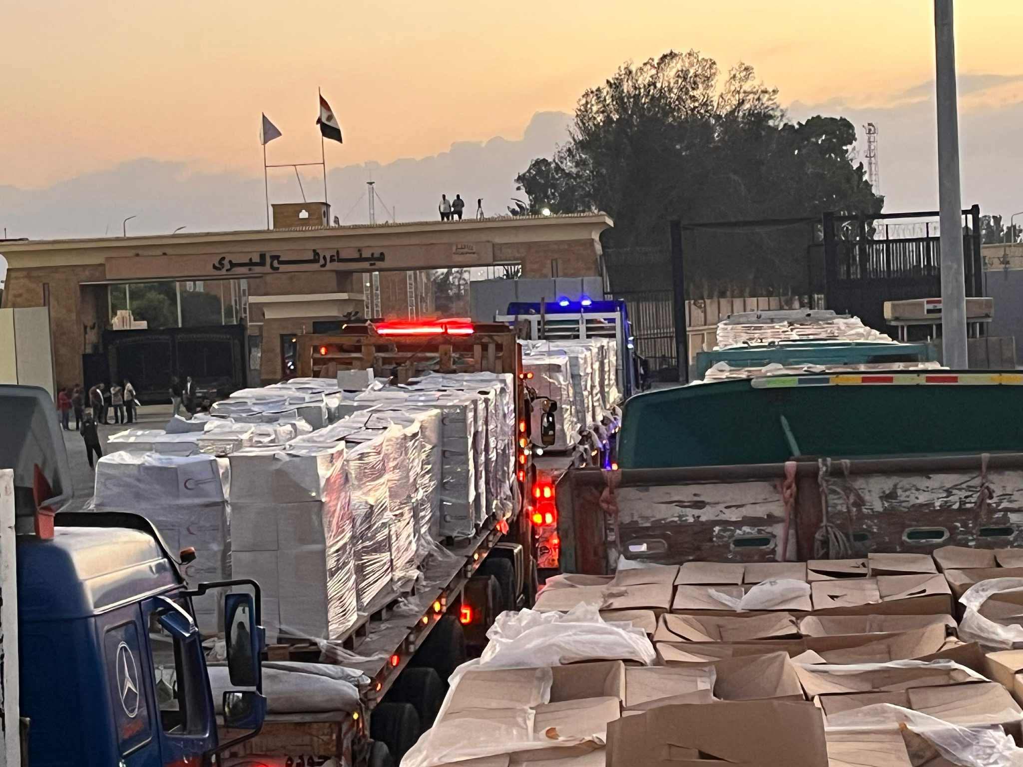 ويتواجد الهلال الأحمر المصري كآلية وطنية لتنسيق وتفويج المساعدات إلى غزة، على الحدود منذ بدء الأزمة حيث لم يتم غلق معبر رفح من الجانب المصري نهائيًا، وواصل تأهبه فى كافة المراكز اللوجستية وجهوده المتواصلة لدخول المساعدات التي بلغت أكثر من نصف مليون طن من المساعدات الإنسانية و الإغاثة، وذلك بجهود 35 ألف متطوع بالجمعية.