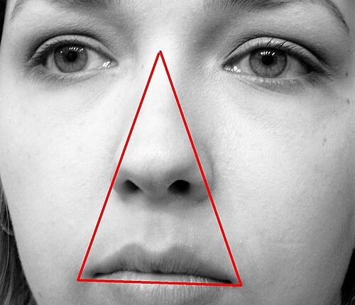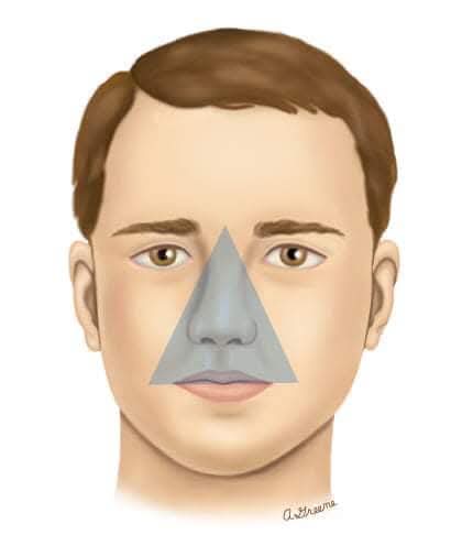 • رأس المثلث: يقع عند جسر الأنف (المنطقة بين الحاجبين).